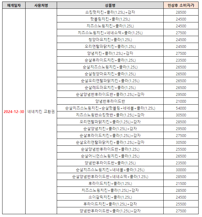 뒤로 공지사항 공지[판매재개] 네네치킨 전상품 재개 안내 (12/30) 안녕하세요. GS&쿠폰입니다. 아래와 같이 네네치킨 전 상품 판매 재개되어 안내 드립니다. * 일시: 24/12/30부터* 사유: 가격 인상 반영 완료* 대상: 전 상품 ※ 첨부파일이 없습니다. 이전글 목록 다음글 전체메뉴 초특가 홈 견적서 마이페이지 로그인이 필요합니다 로그인 회원가입 전체 카테고리GS&쿠폰이 준비한 다양한 상품을 만나보세요. 초특가 커피/음료 상품권 배달/페이 편의점/마트 치킨/피자/버거 빵/아이스크림 문화/생활 외식/푸드 주유/결합쿠폰 공지사항 이벤트 1:1 문의 대량발송/계약문의 GS&쿠폰 처음이세요? 이용가이드 다운로드 상품목록 다운로드 GS&쿠폰 소개서 사이트맵 어떤 상품을 찾고 계신가요? 정보보호 및 개인정보 관리체계 인증 인증범위 온라인 서비스 운영(모바일 쿠폰) 유효기간 2025-10-01 ~ 2028-09-30