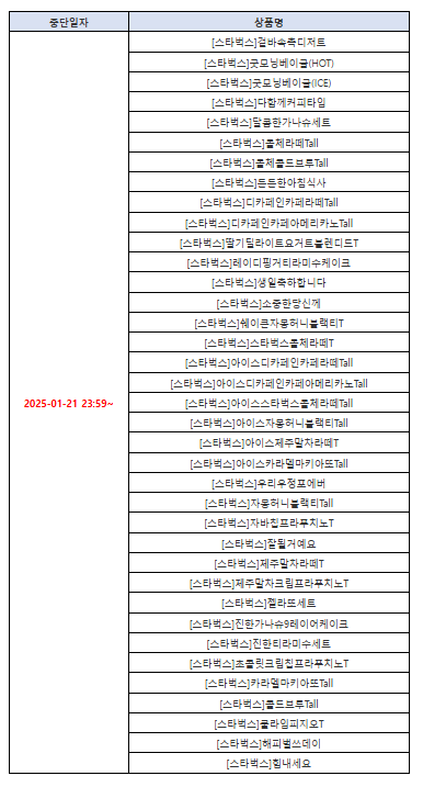 뒤로 공지사항 공지[긴급공지] 스타벅스 일부 상품 운영 중단 안내 (1/21 23:59~) 안녕하세요. GS&쿠폰입니다. 아래와 같이 스타벅스 일부 상품 중단 예정으로 안내 드립니다. 감사합니다.* 일시: 25/01/21 23:59~ * 사유: 상품 리뉴얼* 대상: 아래 상품* 비고: 예약 발송 불가 ※ 첨부파일이 없습니다. 이전글 목록 다음글 전체메뉴 초특가 홈 견적서 마이페이지 로그인이 필요합니다 로그인 회원가입 전체 카테고리GS&쿠폰이 준비한 다양한 상품을 만나보세요. 초특가 커피/음료 상품권 배달/페이 편의점/마트 치킨/피자/버거 빵/아이스크림 문화/생활 외식/푸드 주유/결합쿠폰 공지사항 이벤트 1:1 문의 대량발송/계약문의 GS&쿠폰 처음이세요? 이용가이드 다운로드 상품목록 다운로드 GS&쿠폰 소개서 사이트맵 어떤 상품을 찾고 계신가요? 정보보호 및 개인정보 관리체계 인증 인증범위 온라인 서비스 운영(모바일 쿠폰) 유효기간 2025-10-01 ~ 2028-09-30