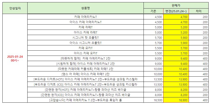 뒤로 공지사항 공지[긴급공지] 스타벅스 일부 상품 가격인상 안내의 건 안녕하세요. GS&쿠폰입니다. 아래와 같이 스타벅스 일부 상품 가격이 1/24부로 인상되어 안내드립니다. 감사합니다. * 일시 : 25/01/24 00:00 ~* 사유 : 지속적인 환율 및 원가 상승* 대상 : 아래 상품 ※ 첨부파일이 없습니다. 이전글 목록 다음글 전체메뉴 초특가 홈 견적서 마이페이지 로그인이 필요합니다 로그인 회원가입 전체 카테고리GS&쿠폰이 준비한 다양한 상품을 만나보세요. 초특가 커피/음료 상품권 배달/페이 편의점/마트 치킨/피자/버거 빵/아이스크림 문화/생활 외식/푸드 주유/결합쿠폰 공지사항 이벤트 1:1 문의 대량발송/계약문의 GS&쿠폰 처음이세요? 이용가이드 다운로드 상품목록 다운로드 GS&쿠폰 소개서 사이트맵 어떤 상품을 찾고 계신가요? 정보보호 및 개인정보 관리체계 인증 인증범위 온라인 서비스 운영(모바일 쿠폰) 유효기간 2025-10-01 ~ 2028-09-30