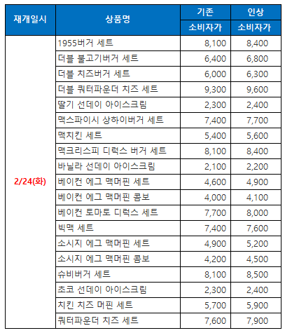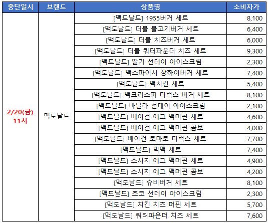 뒤로 공지사항 공지[판매중단] 맥도날드 19종 상품 판매중단 안내의 건 (재개 완료) 안녕하세요, GS&쿠폰입니다. 맥도날드 일부 상품 판매 중단 안내 드립니다. * 브랜드 : 맥도날드* 중단일자 : 2026.02.20 11:00 ~* 중단사유 : 브랜드사 사정에 의한 중단* 판매재개일시 : 2월 넷째주 예정* 비고 : 기발급 쿠폰은 정상 사용 가능* 중단상품 가격인상 및 판매 재개되어 안내드립니다. 감사합니다. ※ 첨부파일이 없습니다. 이전글 목록 다음글 전체메뉴 초특가 홈 견적서 마이페이지 로그인이 필요합니다 로그인 회원가입 전체 카테고리GS&쿠폰이 준비한 다양한 상품을 만나보세요. 초특가 커피/음료 상품권 배달/페이 편의점/마트 치킨/피자/버거 빵/아이스크림 문화/생활 외식/푸드 주유/결합쿠폰 공지사항 이벤트 1:1 문의 대량발송/계약문의 GS&쿠폰 처음이세요? 이용가이드 다운로드 상품목록 다운로드 GS&쿠폰 소개서 사이트맵 어떤 상품을 찾고 계신가요? 정보보호 및 개인정보 관리체계 인증 인증범위 온라인 서비스 운영(모바일 쿠폰) 유효기간 2025-10-01 ~ 2028-09-30