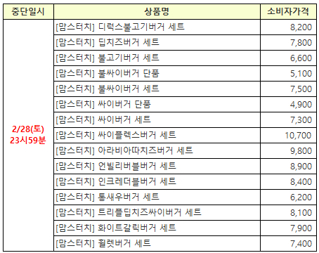 뒤로 공지사항 공지[판매중단] 맘스터치 15종 상품 판매중단 안내의 건(재개 완료) 안녕하세요, GS&쿠폰입니다. 맘스터치 일부 상품 판매 중단 안내드립니다. * 브랜드 : 맘스터치* 중단일자 : 2026.02.28 23:59 ~* 중단사유 : 브랜드사 사정에 의한 중단* 판매재개일시 : 3월 첫째주 예정* 비고 : 기발급 쿠폰은 정상 사용 가능* 중단상품 가격인상 및 판매 재개되어 안내드립니다. 감사합니다. ※ 첨부파일이 없습니다. 이전글 목록 다음글 전체메뉴 초특가 홈 견적서 마이페이지 로그인이 필요합니다 로그인 회원가입 전체 카테고리GS&쿠폰이 준비한 다양한 상품을 만나보세요. 초특가 커피/음료 상품권 배달/페이 편의점/마트 치킨/피자/버거 빵/아이스크림 문화/생활 외식/푸드 주유/결합쿠폰 공지사항 이벤트 1:1 문의 대량발송/계약문의 GS&쿠폰 처음이세요? 이용가이드 다운로드 상품목록 다운로드 GS&쿠폰 소개서 사이트맵 어떤 상품을 찾고 계신가요? 정보보호 및 개인정보 관리체계 인증 인증범위 온라인 서비스 운영(모바일 쿠폰) 유효기간 2025-10-01 ~ 2028-09-30